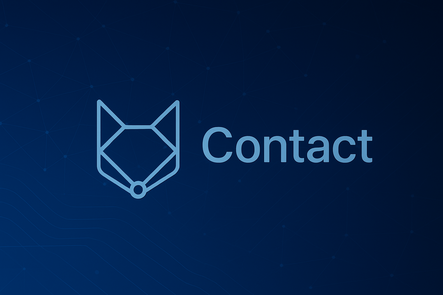 A digital graphic with a dark blue background featuring a light blue line art of a stylized fox head next to the word 'Contact' in light blue text.
