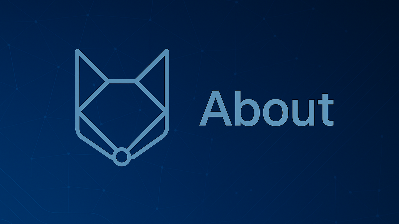 A dark blue digital background with a stylized fox outline logo and the word "About" next to it.